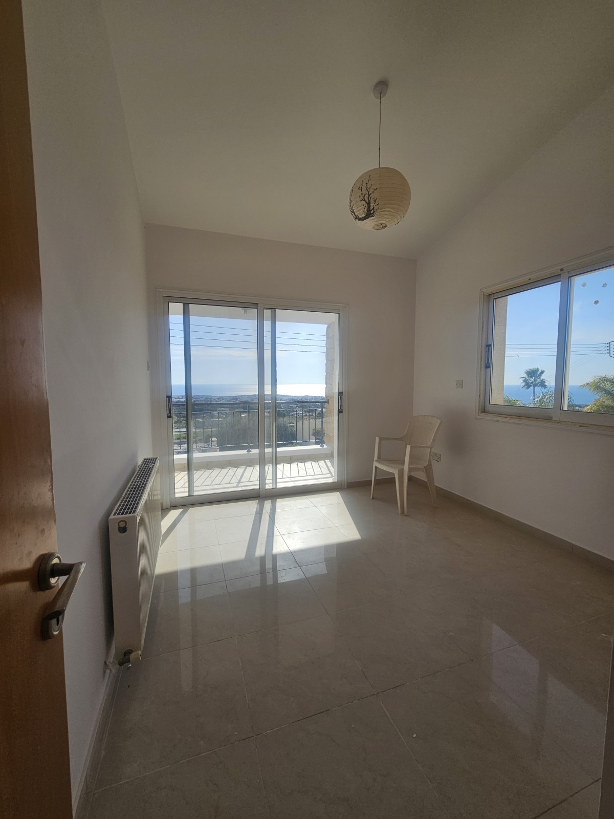 The ground floor comprises a bright open-plan living and dining area with kitchen, a small storage room, and a guest WC. The upper floor consists of three bedrooms, including a master bedroom with en-suite shower, plus a separate family bathroom. All three bedrooms enjoy private verandas with stunning sea views.